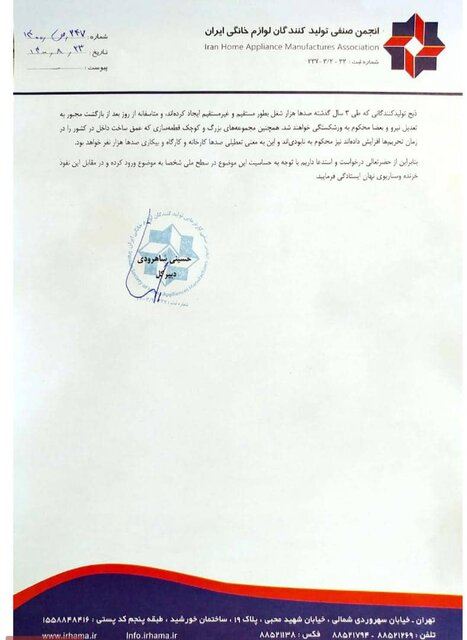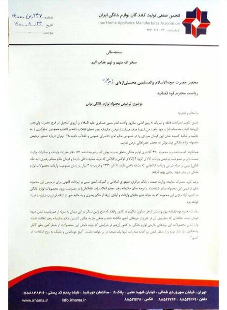 دبیر انجمن صنفی تولیدکنندگان لوازم خانگی، در نامهای به رئیس قوه قضائیه، با اشاره به حکم اخیر دادسرای عمومی و انقلاب ناحیه ۲۸ تهران درباره دستور ترخیص محموله لوازم خانگی برند بوش، آزادسازی این محموله را به منزله عبور مافیای واردات دانسته و نسبت به احتمال تعطیلی صدها کارخانه و کارگاه و بیکاری صدها هزار نفر هشدار داده است.