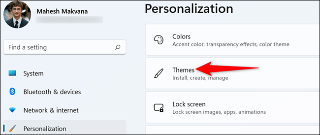 بعد از ورود به منوی Personalization، از سمت راست روی گزینهی Themes کلیک کنید.