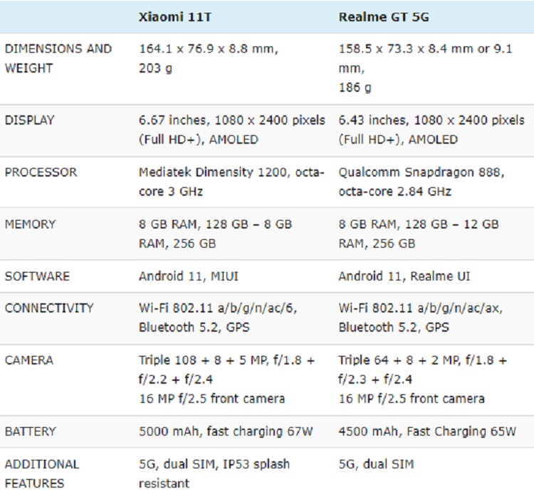 روی هم رفته، گوشی شیائومی ۱۱ تی صفحه نمایش بهتر، دوربین برتر و همچنین باتری بزرگتری دارد، در حالی که Realme GT 5G بخش سخت افزار قویتر و طراحی جذابتر با قیمت مقرون به صرفهتر را ارائه میدهد. هر دو قاتل پرچمدار شگفتانگیزی هستند و هر دو دارای قیمتهای مناسبی برای این رده هستند، بنابراین انتخاب یکی از این دو، به احتمال زیاد باید به سلیقه واگذار شود.