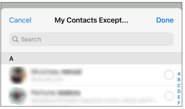 گزینه «My Contacts Except» را انتخاب و سپس باید دوستان خاص مدنظرتان را انتخاب کنید.