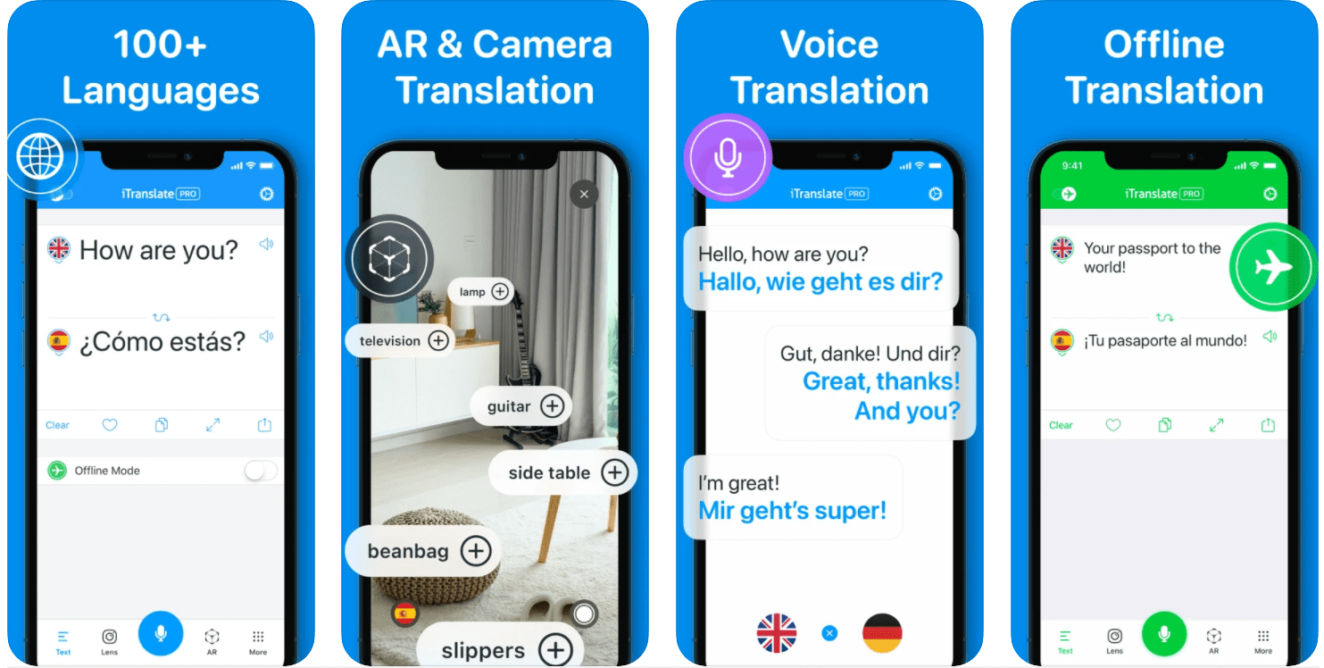 بسیاری از اپلیکیشنهای ترجمه و مترجمی، تنها قابلیت ترجمه متنها را دارند. برنامه iTranslate میتواند متن و همچنین ترجمه صوتی زنده را به بیش از ۱۰۰ زبان ارائه کند. این برنامه مزیتهای زیادی دارد که با دیگر برنامههای این حیطه، اصلا قابل مقایسه نیست و آن را به یک برنامه خاص و پرطرفدار تبدیل کردهاست. استفاده از این برنامه، برای افرادی که زیاد سفر میکنند، کاملا ضروری است. با این برنامه شما به فردی تبدیل میشوید که به ۱۰۰ زبان زنده در دنیا، میتواند ارتباط برقرار کند.