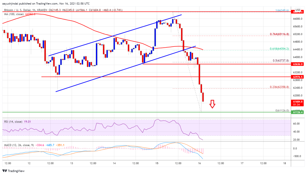بیتکوین در ۲۴ ساعت گذشته ۷ درصد ریزش کرد و از محدوده ۶۵ هزار دلار به ۶۱ هزار دلار رسیده است.