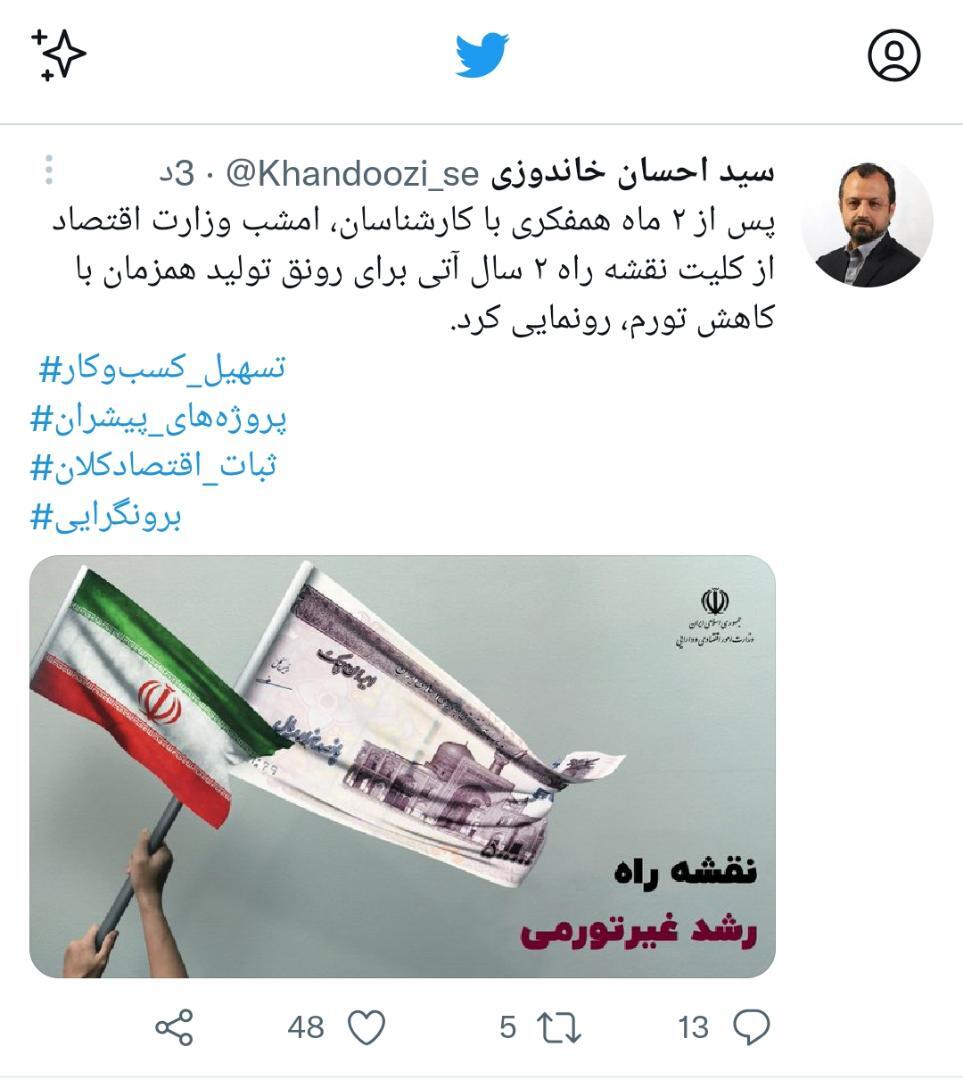 خاندوزی وزیر اقتصاد در توئیتی نوشت: پس از ۲ ماه همفکری با کارشناسان، امشب وزارت اقتصاد از کلیت نقشه راه ۲ سال آتی برای رونق تولید همزمان با کاهش تورم، رونمایی کرد.