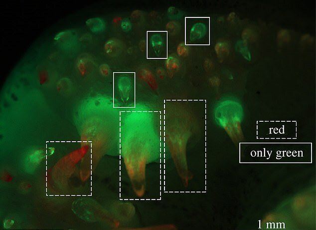 پس از گذشت ۱۰ روز محققان ماهیها را به مخزن دیگری با رنگ سبز فلورسنت منتقل کردند تا دندانها باز هم رنگ بگیرد.