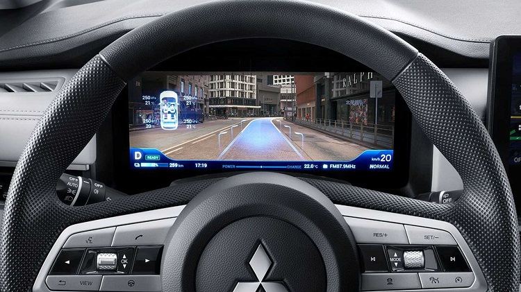 کراس اوور برقی Airtrek ۲۰۲۲ جدیدترین مدلی است که دارای چراغهای جلو تقسیم شده با چراغهای LED در روز است که در بالای سپر قرار گرفته اند در حالی که دسته چراغهای اصلی V شکل در زیر نصب شده است. این طرح مطابق با محصولات اخیر میتسوبیشی است که به این کراس اوور جمع و جور، جلوهای جسورانه میبخشد. چراغهای جلوی عجیب و غریب در کنار یک جلوپنجره بسته با فرورفتگیهای شش ضلعی در سه میله خاکستری قرار گرفتهاند. اگر به دقت نگاه کنید، متوجه خواهید شد که دوربین جلو درست زیر لوگو نصب شده و یک سنسور رادار بزرگ نیز کمی پایینتر روی سپر قرار گرفته است.