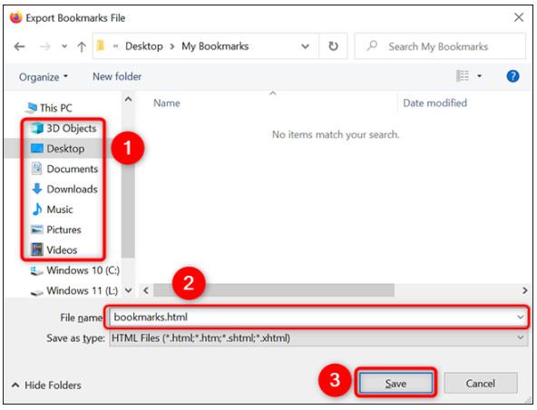 یک پنجره « Export Bookmarks File» باز می شود. در اینجا، پوشه ای را برای ذخیره بوک مارک های خود انتخاب کنید. در صورت تمایل، یک نام سفارشی برای فایل بوکمارک های خود در قسمت « File Name» وارد کنید. سپس روی «save» کلیک کنید.