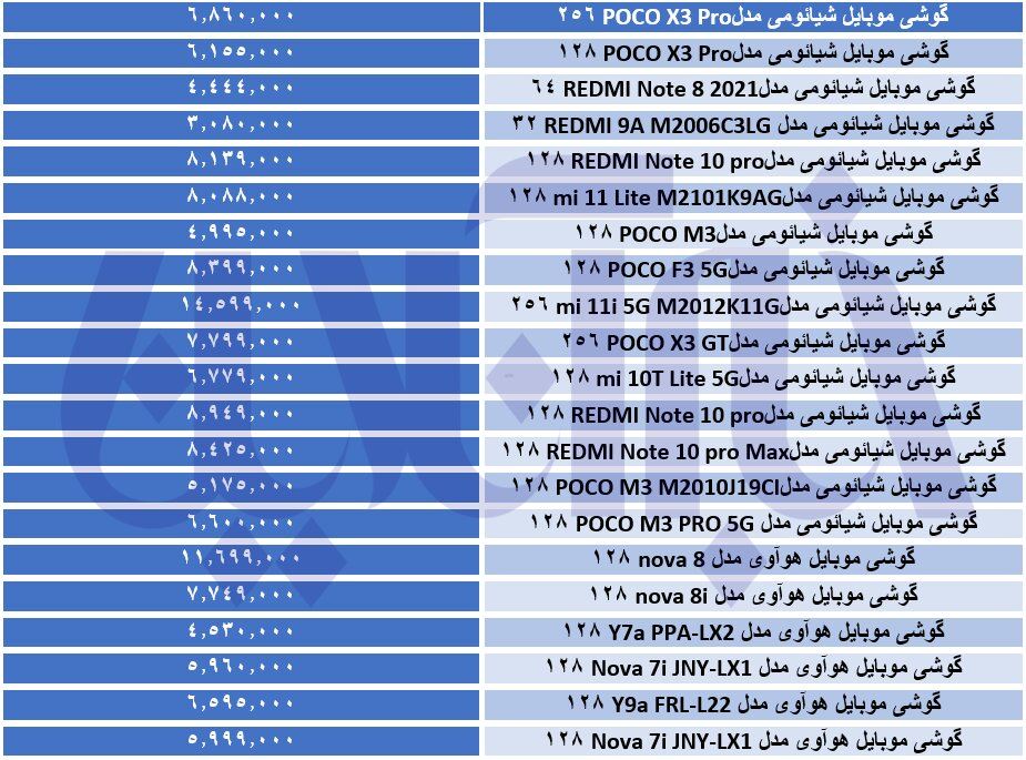 جدیدترین قیمت گوشی های شیائومی و هوآوی