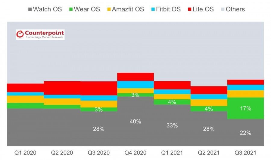 دادههای آماری کانترپوینت نشان میدهند سهم بازار WearOS از ۳ درصد در سه ماهه سوم ۲۰۲۰ به ۱۷ درصد در فصل سوم سال جاری میلادی افزایش پیدا کرده که این موسسه این رشد را به عرضه گلکسی واچ ۴ سامسونگ نسبت میدهد.