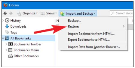 اگر چند روز پیش بوکمارک ها را حذف کردید، از زیر منوی Restore در قسمت Import and Backup استفاده کنید. فایرفاکس به طور خودکار هر روز یک نسخه پشتیبان از بوکمارک های شما ایجاد می کند و ارزش چندین روز را ذخیره می کند.