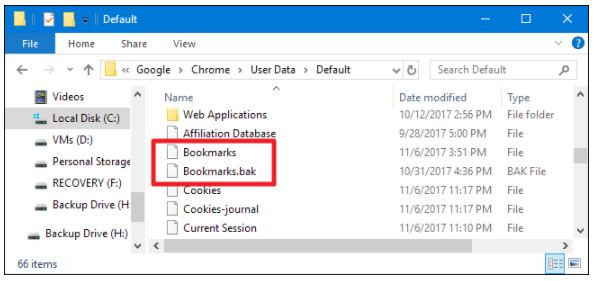 پوشه حاوی دو فایل بوکمارک Bookmarks و Bookmarks.bak است که Bookmarks.bak جدیدترین نسخه پشتیبان است که در آخرین باری که مرورگر خود را باز کردید گرفته شده است.