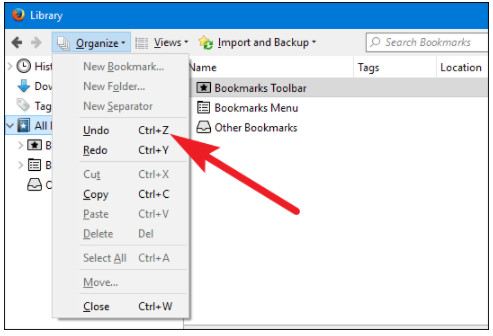 کاربران فایرفاکس خیلی راحت تر هستند. اگر به تازگی یک بوکمارک یا پوشه بوکمارک را حذف کرده اید، فقط می توانید کلیدهای Ctrl+Z را در پنجره کتابخانه یا نوار کناری بوکمارک ها فشار دهید تا آن را بازگردانید. در پنجره کتابخانه، می‌توانید دستور Undo را در منوی « Organize » نیز پیدا کنید.