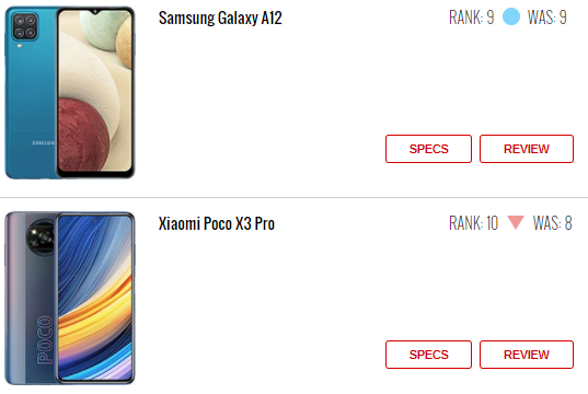 گوشی Galaxy A۱۲ سامسونگ رتبه نهم را حفظ کرده و رتبه دهم این هفته نیز متعلق به Xiaomi Poco X۳ Pro است.