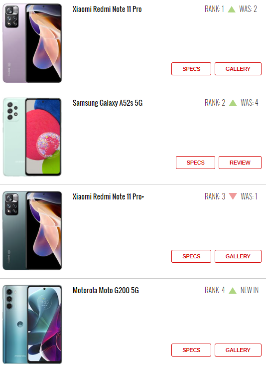 همچنین در رده چهارم فهرست پرطرفدارترین گوشی‌های هوشمند این هفته، گوشی تازه وارد Motorola Moto G۲۰۰، ۵G دیده می‌شود که باید دید در هفته‌های آتی چه وضعیتی خواهد داشت.