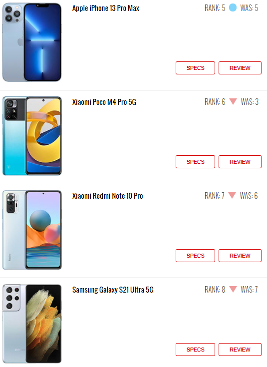 اما نیمه دوم جدول پرطرفدارترین گوشی‌های هوشمند هفته وضعیتی نزولی دارد. به عنوان مثال گوشی Xiaomi Poco M۴ Pro ۵G که هفته قبل در رده سوم قرار گرفته بود این هفته در رتبه ششم دیده می‌شود.