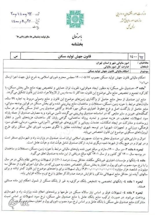 احکام مالیاتی قانون جهش تولید مسکن مصوب ۱۴۰۰/۰۵/۱۷ مجلس شورای اسلامی به شرح ذیل جهت اجرا ارسال می‌شود.