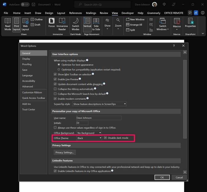 در کنار طرح زمینه آفیس، روی کادر Disable dark mode کلیک کنید.