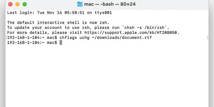 اکنون برای قرار دادن قفل روی موارد آنلاک میتوان از دستور زیر استفاده کرد. تنها کافیست تا [File path] را با آدرس فایل دلخواه خود جایگزین کنید و کلید Return را بزنید.