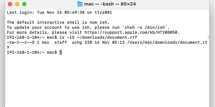 نشانگر uchg میتوانید وضعیت قرارگیری قفل روی یک مورد خاص را بررسی نماید. اگر این عبارت در خروجی دستور گفته شده مشاهده شد، میتوان نتیجه گرفت که آیتم انتخاب شده قفل بوده است و در غیر این صورت میتوان از قفل نبودن آن اطمینان کسب کرد.