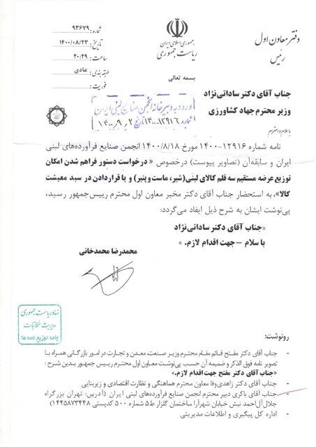 پیرو نامه ۱۸ آبان ماه انجمن صنایع فرآوردههای لبنی ایران به معاون اول رئیس جمهوری در خصوص تداوم مشکل عرضه محصولات لبنی مشمول تخفیف ۱۰ درصدی، محمد مخبر معاون اول رئیس جمهوری در راستای نامه انجمن صنایع لبنی از وزیر جهاد خواسته است تا مشکل عرضه محصولات لبنی را با قرار دادن این محصولات در سبد کالای دهک های محروم حل کند.