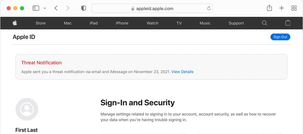 اخیرا اپل اعلام کرده بود که شکایتی علیه NSO و شرکت مادرش تنظیم کرده است تا این شرکت را برای نظارت و هدف قرار دادن کاربران اپل متهم کند. NSO همچنین در حال حاضر با یک شکایت متفاوت، اما مشابه توسط فیس بوک متا به دلیل نقشش در هک کردن کاربران واتساپ مواجه است. اعلامیه اپل بیان میکند که از این پس، به کاربران آسیبدیده از طریق ایمیل و iMessage اعلانهایی ارسال میشوند و همچنین یک «اعلان تهدید» به صفحه وب اپل ID آنها ارسال میشود که چیزی شبیه به این است: