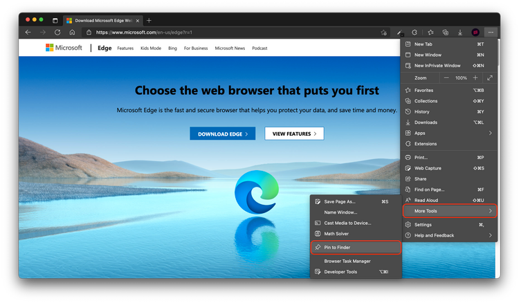 برای پین کردن یک سایت به تسکبار یا فایندر، ابتدا روی آیکن سه نقطه در گوشه بالایی سمت راست کلیک کنید و سپس با مراجعه به قسمت More Tools، گزینه Pin to Taskbar را انتخاب کنید؛ البته اگر از نسخه مک اواس مرورگر مایکروسافت اج استفاده میکنید، گزینه گفته شده تحت عنوان Pin to Finder یافت خواهد شد. اکنون میتوانید برای آیتم جدید نام دلخواه خود را انتخاب نمایید و در نهایت روی کلید Pin کلیک کنید.