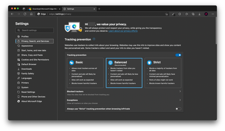 مرورگرهایی که تمرکز ویژهای روی حفظ حریم خصوصی مصرفکنندگان خود دارند (مانند Brave)، از قابلیت داخلی مسدودکننده رهگیری وب و پایش کاربران بهره میگیرند. چنین قابلیتی به صورت پیشفرض در داخل مایکروسافت اج نیز قرار گرفته است؛ اما در این مرورگر امکان کنترل تعداد سرویسهای رهگیری مسدود شده هم وجود دارد.