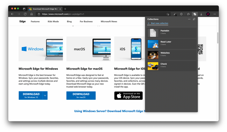 آیا تا به حال به ذخیره کردن قسمتهایی از یک صفحه، تصاویر و سایر موارد مشابه در کنار یکدیگر فکر کردهاید؟ نسخه جدید اج چنین فرصتی را تحت عنوان Collections فراهم کرده است. برای مثال میتوان لینک کالای مشابه را جهت خرید در آینده با یکدیگر ذخیره کرد یا یادداشتهای موردنیاز برای نگارش یک مطلب را در گروهی یکسان تجمیع نمود.