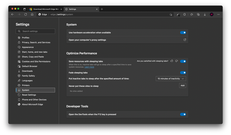 تبهای باز شده میتوانند منابع مختلف دستگاه به خصوص رم را اشغال کنند، حتی اگر بدون استفاده رها شده باشند. برخی مرورگرها از جمله اج از ویژگی Sleeping Tabs بهرهمند هستند که به کمک آن، میتوانند مشکل گفته شده را حل کنند. در هنگام فعال بودن قابلیت مذکور، مرورگر به صورت خودکار تبهای بدون استفاده را پس از گذشت مقدار زمان مشخص غیرفعال میکند. در نتیجه استفاده از منابع سیستم کاهش مییابد و سرعت کلی کار با آن افزایش پیدا خواهد کرد.