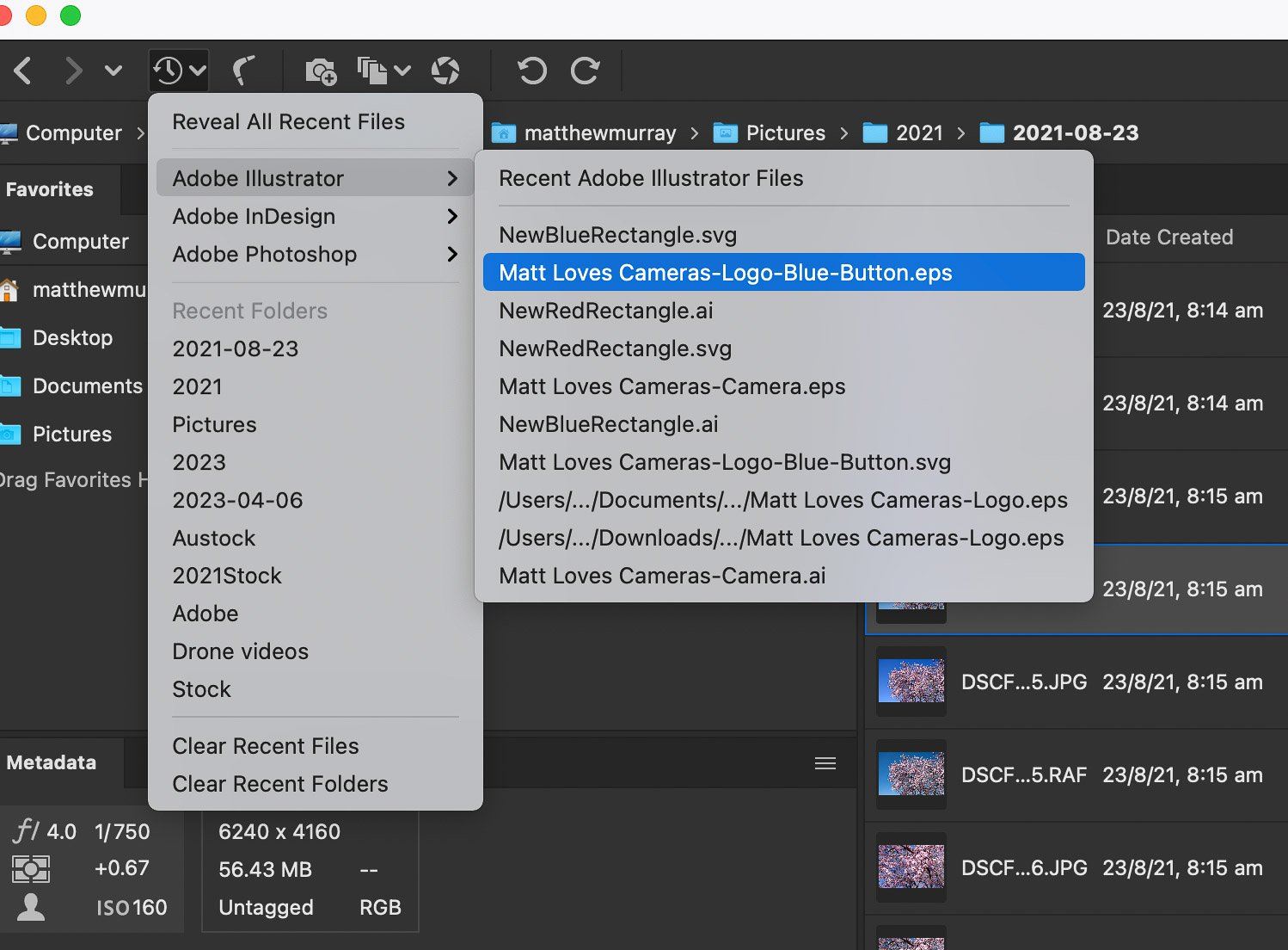 بریج همچنین چند ترفند بسیار جالب و کارآمد در آستین خود دارد! برای مثال میتوان به گزینهی کاربردی All Recent Files اشاره کرد که از طریق آن میتوانید آخرین فایلهایی را که در نرمافزار Illustrator، InDesign و Photoshop روی آنها در کار کردهاید، سریعا پیدا کنید.