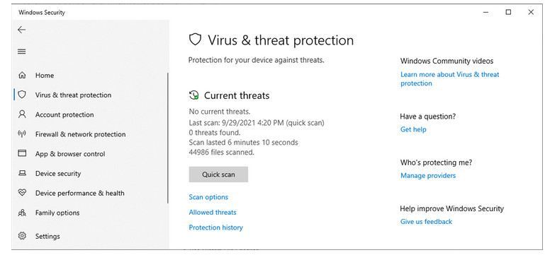 از منوی سمت چپ، Windows Security را باز کرده و روی ویروس و محافظت از تهدید کلیک کنید.