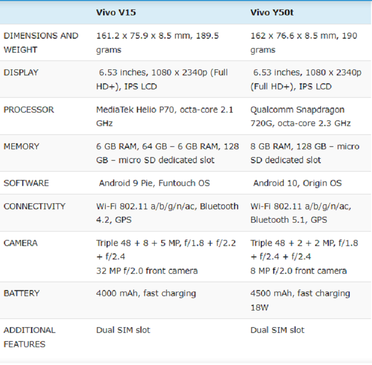 گوشی Vivo Y50t به دلیل چیپست بهتر، باتری بزرگتر، نرم افزار به روز شده، برنده این مقایسه است، اما Vivo V15 گوشی بهتری برای سلفی است و دارای دوربین فوق عریض قوی و طراحی بهتر در مقایسه با مدل جدیدتر است.
