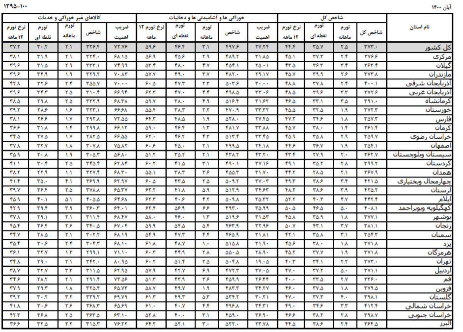 نرخ تورم دوازده ماهه منتهی به آبان ماه ١٤٠٠ برای خانوارهای شهری به عدد ۴۳.۶ درصد رسید. بیشترین نرخ تورم ۱۲ ماهه مربوط به ایلام با ۵١.٤ درصد و کمترین آن مربوط به استان قم با ۴۰ درصد است.