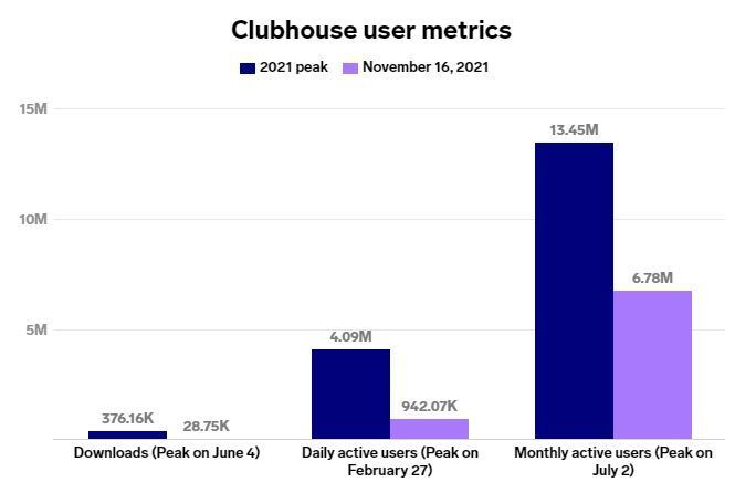 طبق اطلاعات ارائهشده از سوی پلتفرم «اپ آنی» (App Annie)، زمانی که Spaces برای نخستین بار در ماه آوریل معرفی شد، میزان دانلود ماهانه کلاب هاوس برای نخستین بار در سال ۲۰۲۱، به کمتر از یک میلیون کاهش یافت، البته میزان دانلود آن مدتی بعد کمی بهتر شد؛ اما در ماه اکتبر باز هم به ۹۲۸ هزار دانلود رسید.