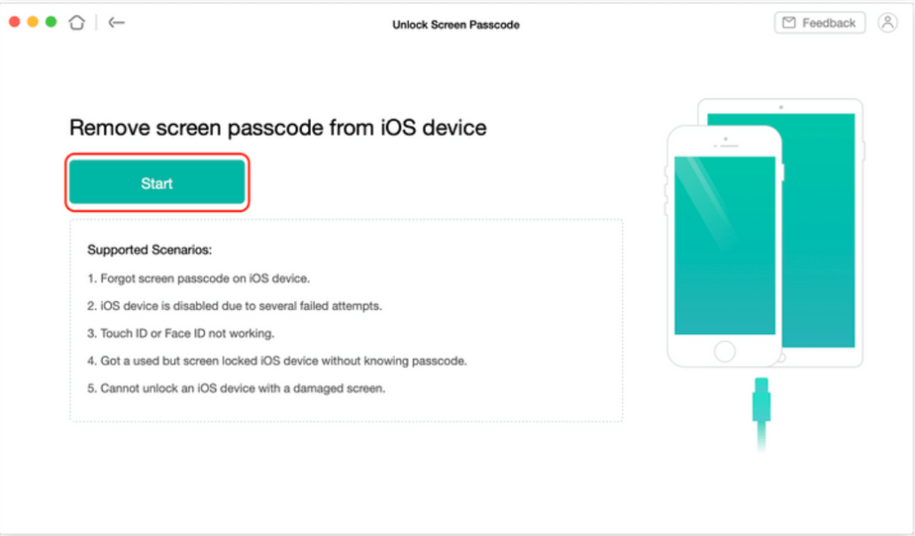 پ) در این مرحله، آیفون خود را از طریق کابل شارژ به رایانه متصل کنید و روی دکمه Start در AnyUnlock کلیک کنید.