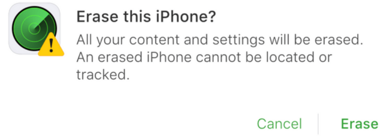 ه) اخطاری را مشاهده خواهید کرد که با تایید آن، اطلاعات روی آیفون شما پاک میشود. اگر با این کار موافق هستید، روی گزینه Erase کلیک کنید. به همین راحتی، آیفون شما بدون پسورد و اطلاعات قبلی در اختیار شما قرار گرفت.