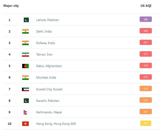 تهران نیز با شاخص کیفیت هوای ۱۵۷ در بین ۱۰ شهر آلوده جهان در رتبه چهارم است.
