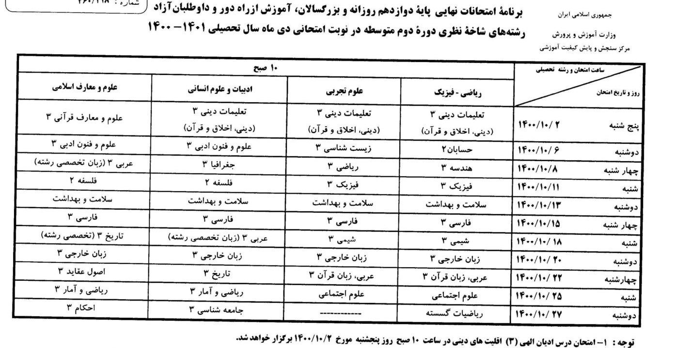امتحانات نهایی پایه دوازدهم دانشآموزان روزانه و بزرگسالان، آموزش از راده دور و داوطلبان آزاد از پنجشنبه دوم دی ماه ۱۴۰۰ آغاز میشود.