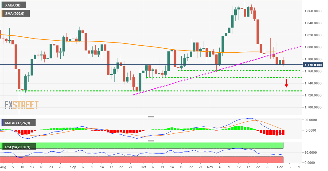 از منظر فنی نیز قیمت طلا در زیر میانگین حرکت 200 روزه خود قرار گرفته است و حرکتی نزولی را نشان می دهد. در صورتی که جهت حرکت طلا معکوس نشود، دو هرف نزولی 1759 دلاری و 1750 دلاری در پیش روی آن خواهد بود.