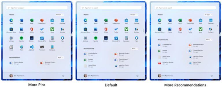 میرسیم به مهمترین تغییر ویندوز ۱۱ یعنی منوی استارت آن، جایی که بیشترین توجه از زمان عرضهی این سیستمعامل تاکنون به آن شده است. اکنون کاربران میتوانند با کلیک راست روی منوی استارت، به تنظیمات آن دسترسی داشته باشند یا گزینههایی نظیر More Pins یا More Recommendation را به کاربران نمایش میدهد تا یک ردیف دیگر از آنچه ویندوز بهعنوان بخشهای پین شده یا پیشنهادی به کاربر نشان میدهد به نمایش در بیاید.
