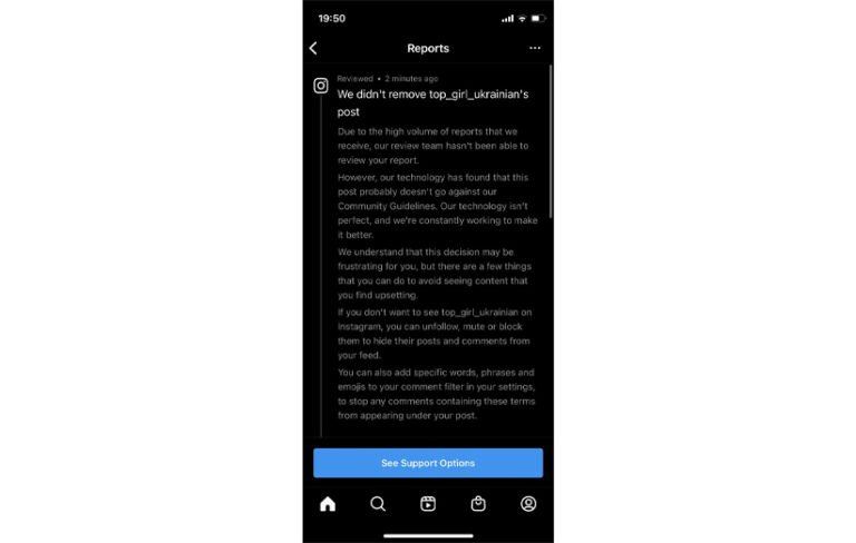 اما شخصی که به بررسی این مشکل پرداخته بود میگوید بعد از ریپورت کردن یکی از حسابهای کاربری که شامل محتوی نامناسب مثبت ۱۸ سال بود در حالی که هیچ یک از دستههای بالا را هم شامل نمیشد، یک پیغام از سوی اینستاگرام برایش به نمایش درآمد با این مضمون که هیچ مشکلی با این حساب کاربری وجود نداشته و پستهایش با قوانین اینستاگرام مغایرت ندارد. اینطور که به نظر میرسد، اینستاگرام برای مشاهدهی حسابهای ریپورت شده به خاطر نمایش محتوای مثبت ۱۸ سال، از نیروی انسانی کمک نمیگیرد یا به قول این فرد، حداقل هفتهی پیش که این اتفاق رخ داد چنین چیزی وجود نداشت. ظاهرا کنترل این ریپورتها بر عهدهی هوش مصنوعی است که طبیعتا در تشخیص محتوی نامناسب همیشه عملکرد درستی ندارد.