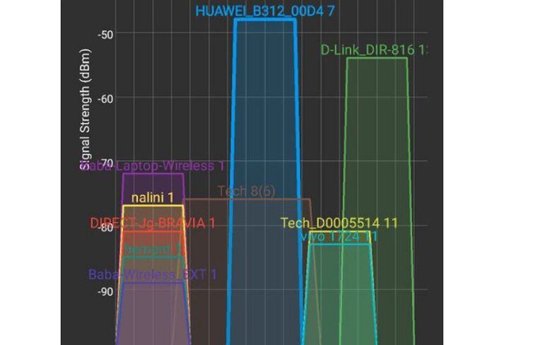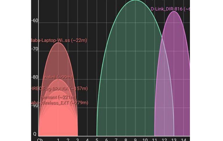 اپلیکیشن WiFi Analyzer یک نمودار گرافیکی از قدرت آنتندهی شبکه به شما نشان میدهد و همچنین نقاط دسترسی و فاصلهی تخمینی تا آنها را نیز محاسبه میکند. با این برنامه کاربران میتوانند تا عملیات اسکن را متوقف یا آن را دوباره از سر بگیرند و شبکههای وای فای را برای رتبهبندی کانالهای مختلف تجزیه و تحلیل کنند.