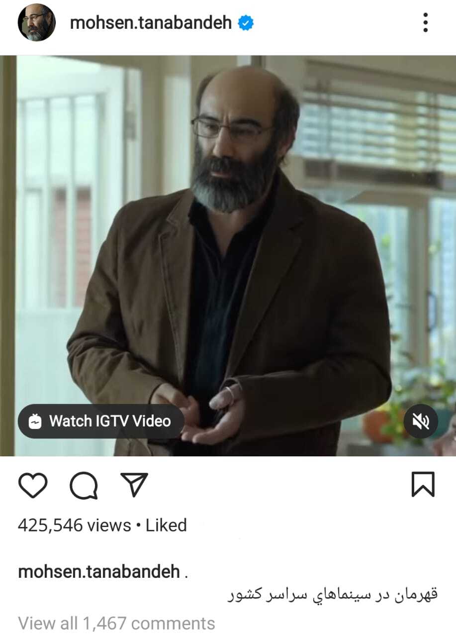 محسن تنابنده، بازیگر سینما و تلویزیون، در فضای مجازی و صفحه اینستاگرامش ۵/۸ میلیون فالوور دارد و در سه پست آخرش ۸۴۱.۲۱۶ بازدید داشته است.