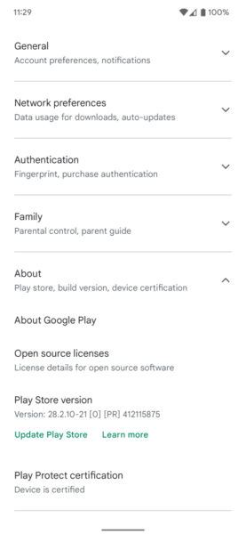 گزینه جدیدی که به گوگل پلی اضافه شده، در بخش Play Store > Settings > About دیده میشود. این دکمه Update Play Store نام دارد و اجازه میدهد تا بهسرعت ببینید نسخه جدیدی برای پلی استور منتشر شده یا خیر. تا قبل از این تغییر، کاربران با لمس شماره نسخه فروشگاه اپلیکیشنهای گوگل میتوانستند این بررسی را انجام دهند، اما مشخصه واضحی برای این کارکرد وجود نداشت. در نتیجه، بسیاری از کاربران از وجود آن آگاه نبودند.