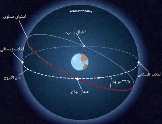 مدیر انجمن آماتوری ایران خاطر نشان کرد: در حقیقت، تصویر صفحه مداری زمین بر کره آسمان که با نام "دایرةالبروج" و یا مسیر حرکت ظاهری خورشید بر روی کره آسمان شناخته میشود، با استوای آسمان که کره آسمان را به دو قسمت مساوی تقسیم کرده است، زاویه ۲۳.۵ درجه داشته و همین نکته باعث میشود که دو دایره استوای آسمان و دایرةالبروج در دو نقطه همدیگر را قطع کرده که از آنها به نامهای "اعتدال بهاری" و "اعتدال پاییزی" یاد میشود که طول شب و روز در آنها با یکدیگر برابر هستند.