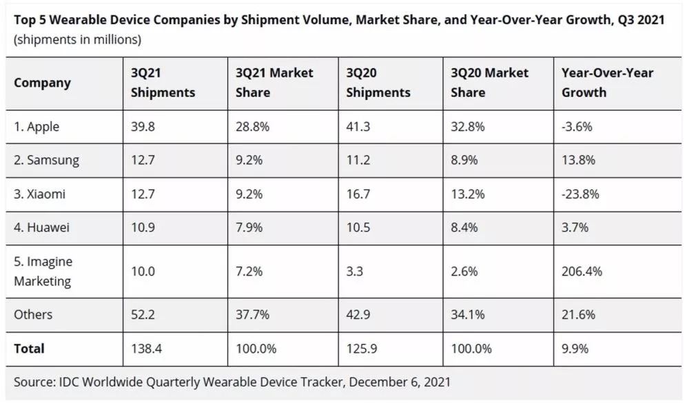 در ادامه، در رتبه چهارم نام هواوی دیده میشود که با رشد سالانه ۳.۷ درصدی سهم بازار خود را به ۷.۹ درصد رسانده است. طبق این گزارش، در مجموع در فصل سوم ۲۰۲۱ حدود ۱۳۸ میلیون دستگاه پوشیدنی فروخته شده است. IDC مدعی است مصرفکنندگان ساعتهای هوشمند ارزان قیمت را به دستبندهای سلامتی ترجیح میدهند. به نظر میرسد که دسترسی به امکانات بیشتر برای کاربران اولویت بالاتری دارد.