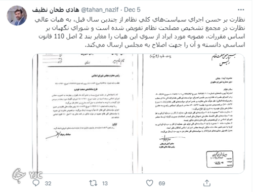 از طرفی طرح واردات خودرو که پس از رفت و آمدهای بسیار که مورد تایید شورای نگهبان قرار گرفته بود از مجمع تشخیص مصلحت نظام رد شد به گونه ای که سخنگوی شورای نگهبان در توییتی اعلام کرد: نظارت بر حسن اجرای سیاستهای کلی نظام از چندین سال قبل، به هیات عالی نظارت در مجمع تشخیص مصلحت نظام تفویض شده است و شورای نگهبان بر اساس مقررات، مصوبه مورد ایراد از سوی این هیات را مغایر بند ۲ اصل ۱۱۰ قانون اساسی دانسته و آن را جهت اصلاح به مجلس ارسال میکند.