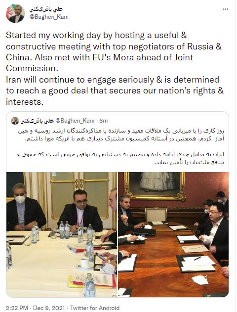 وی در توئیتی درباره دیدارهای امروزش نوشت: روز کاری را با میزبانی یک ملاقات مفید و سازنده با مذاکرهکنندگان ارشد روسیه و چین آغاز کردم. همچنین در آستانه کمیسیون مشترک دیداری هم با انریکه مورا داشتم. ایران به تعامل جدی ادامه داده و مصمم به دستیابی به توافق خوبی است که حقوق و منافع ملتمان را تأمین کند.