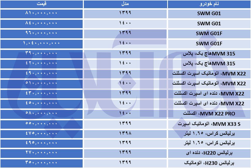 در بین خودروهای ام وی امنیز این افزایش قیمت ها شدت گرفته است به طوری که خودرو ام وی ام 315هاچ بک پلاس مدل 1399 از 370 میلیون تومان در اواخر آبان ماه امروز به 390 میلیون تومان رسیده است و در بین خودروهای SWM نیز مدل G01 سال 1399 آن نیز از 805 میلیون تومان در اواخر آبان ماه امروز به 810 میلیون تومان رسیده است.