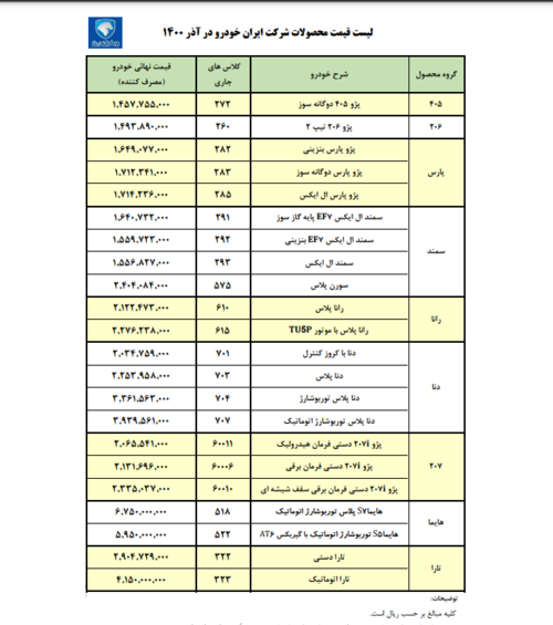 گروه صنعتی ایران خودرو پس از اخذ مجوز افزایش قیمت از ستاد تنظیم بازار، قیمت جدید و مصوب محصولات خود را با احتساب هزینههای مالیات، شماره گذاری، بیمه، عوارض و… برای آذر ۱۴۰۰ منتشر کرد.