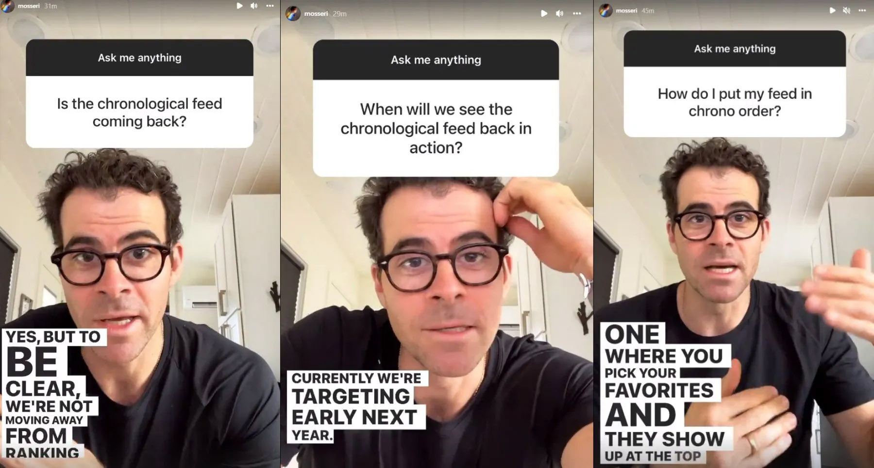 موسری با تکرار آنچه در توییت بالا گفته شده بود، تاکید کرده است که اینستاگرام قصد ندارد شیوه نمایش الگوریتمی پستها در فید را به طور کامل کنار بگذارد تا به ترتیب زمانی بازگردد. انتظار میرود مشابه آنچه در توییتر دیده میشود، کاربران بتوانند حالت مورد علاقه خود را انتخاب نمایند. او اشاره کرده است که ویژگی اولویتدهی به پستها نادیده گرفته نمیشود و معتقد است که چنین قابلیتی میتواند کاربران را به محتوای مرتبط و مهم هدایت کند. در نشست پرسش و پاسخ اخیر توضیحاتی پیرامون قابلیت کنترل والدین نیز از سوی موسری داده شد که انتظار میرود به زودی در اپلیکیشن اینستاگرام فعال شود.